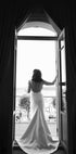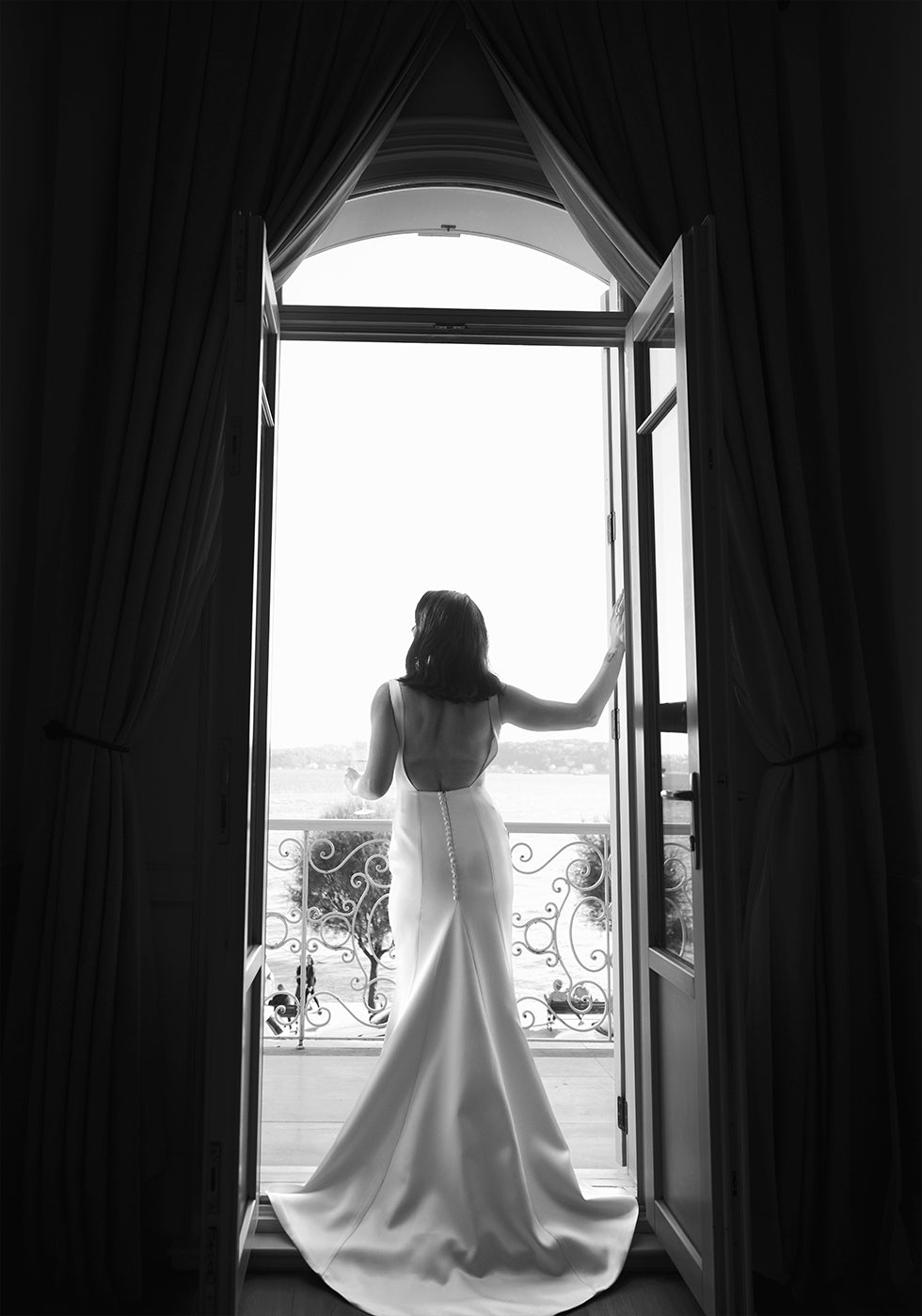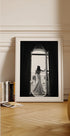 Ein atemberaubendes Schwarz-Weiß-Foto, das die Eleganz einer Frau in einem fließenden Kleid einfängt, die von einem Balkon blickt. Die Komposition unterstreicht zeitlose Anmut, raffinierten Stil und ruhige Schönheit und macht sie zu einem perfekten Kunstwerk für Innenräume, die Mode, Romantik und Raffinesse zelebrieren.