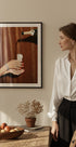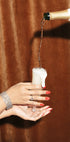 Ein glamouröses Stilllebenfoto, das zeigt, wie Champagner in ein Glas gegossen wird. Der elegante Schmuck, die roten Nägel und die festlichen Details schaffen ein Gefühl von Feierlichkeit, Luxus und Freude – perfekt für Party-inspirierte Wandkunst.