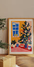 Settle into a snug holiday nook where candles flicker beside a vase of winter florals, evergreen sprigs, and playful ornaments. A frosted window hints at nightfall while a tree twinkles nearby. Painterly textures and vibrant hues bring festive warmth to your space. Artwork by Treechild. Perfect for mantels, reading nooks, and joyful gatherings.