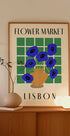 En solrig hyldest til Lissabons blomsterboder: stiliserede vilde blomster i en grafisk vase, sat mod en harmonisk farvepalet af blå, grøn og varme nuancer. Retro typografi med teksten “Flower Market Lisbon Portugal” giver plakaten en nostalgisk markedsstemning. Illustration af Dirkie Nell. Perfekt til en lys, middelhavs-inspireret indretning.