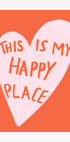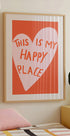 Dieses Kunstwerk zeigt ein handgezeichnetes rosa Herz auf einem orangefarbenen Hintergrund mit den Worten „Das ist mein glücklicher Ort.“ Es strahlt Positivität und Wärme aus und eignet sich perfekt für die Inneneinrichtung oder motivierende Räume.