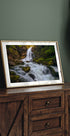 „Spring Flood“ von Daniel Gastager lässt Quellschmelzwasser durch eine Waldschlucht strömen. Seidige Striche gleiten über moosbedeckte Felsen, gesäumt von tiefgrünen Tannen und leichtem Nebel. Ein dramatisches, aber ausgewogenes Naturmotiv, das dem Raum Ruhe, Frische und abenteuerliche Tiefe verleiht. Nordische Atmosphäre und fotografische Finesse runden das Werk ab.