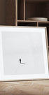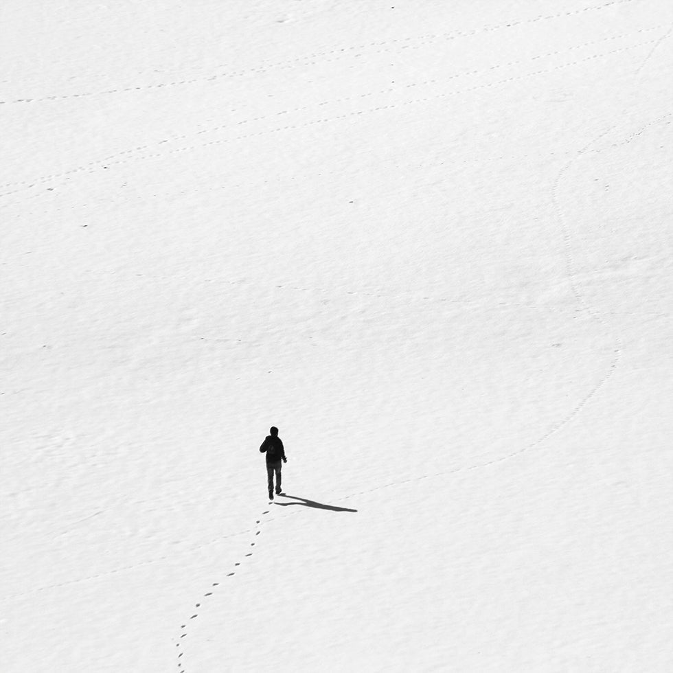 Eine poetische Schwarz-Weiß-Luftaufnahme einer verschneiten Landschaft, in der eine einzelne Person und ihre Fußabdrücke die weiße Stille durchschneiden. Die langen Schatten und der hohe Kontrast erzeugen eine minimalistische Ruhe und ein Gefühl des Eintauchens. Eine zeitlose Winterkomposition von MOSTAFA NODEH. Das Motiv balanciert Stille und Spannung in einem grafischen, verschneiten Raum.