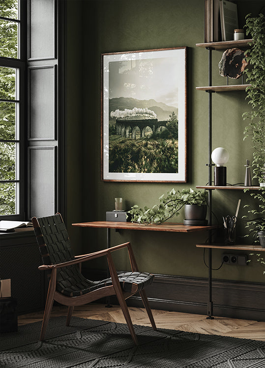 Ein atemberaubendes Foto des Glenfinnan-Viadukts, wo ein altmodischer Dampfzug über die historische Brücke in den schottischen Highlands fährt. Die neblige Landschaft und das dramatische Licht schaffen eine magische und nostalgische Atmosphäre. Perfekt für Reisebegeisterte, Zugliebhaber und alle, die ikonische Naturlandschaften schätzen.