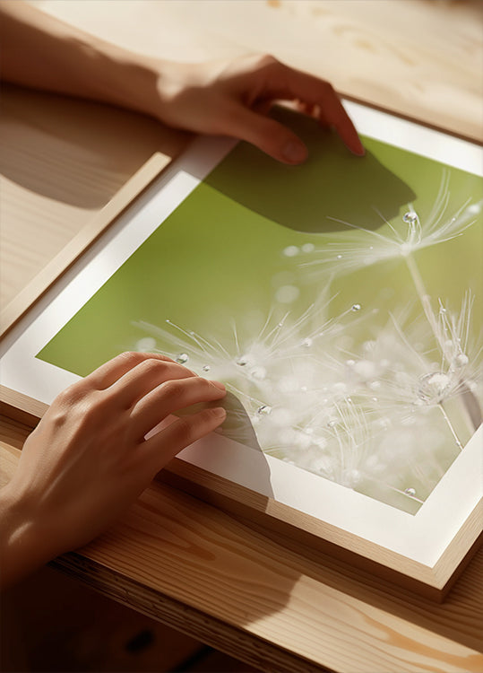 Green von Hilde Ghesquiere fängt einen poetischen Makromoment ein: sanfte Grüntöne, feine Federstrukturen und zarte Wassertropfen, die im Licht wie Perlen funkeln. Ein minimalistisches, beruhigendes Motiv, das zur Ruhe und Besinnung einlädt und die stille Poesie der Natur ins Zuhause bringt. Perfekt für skandinavisches Dekor.