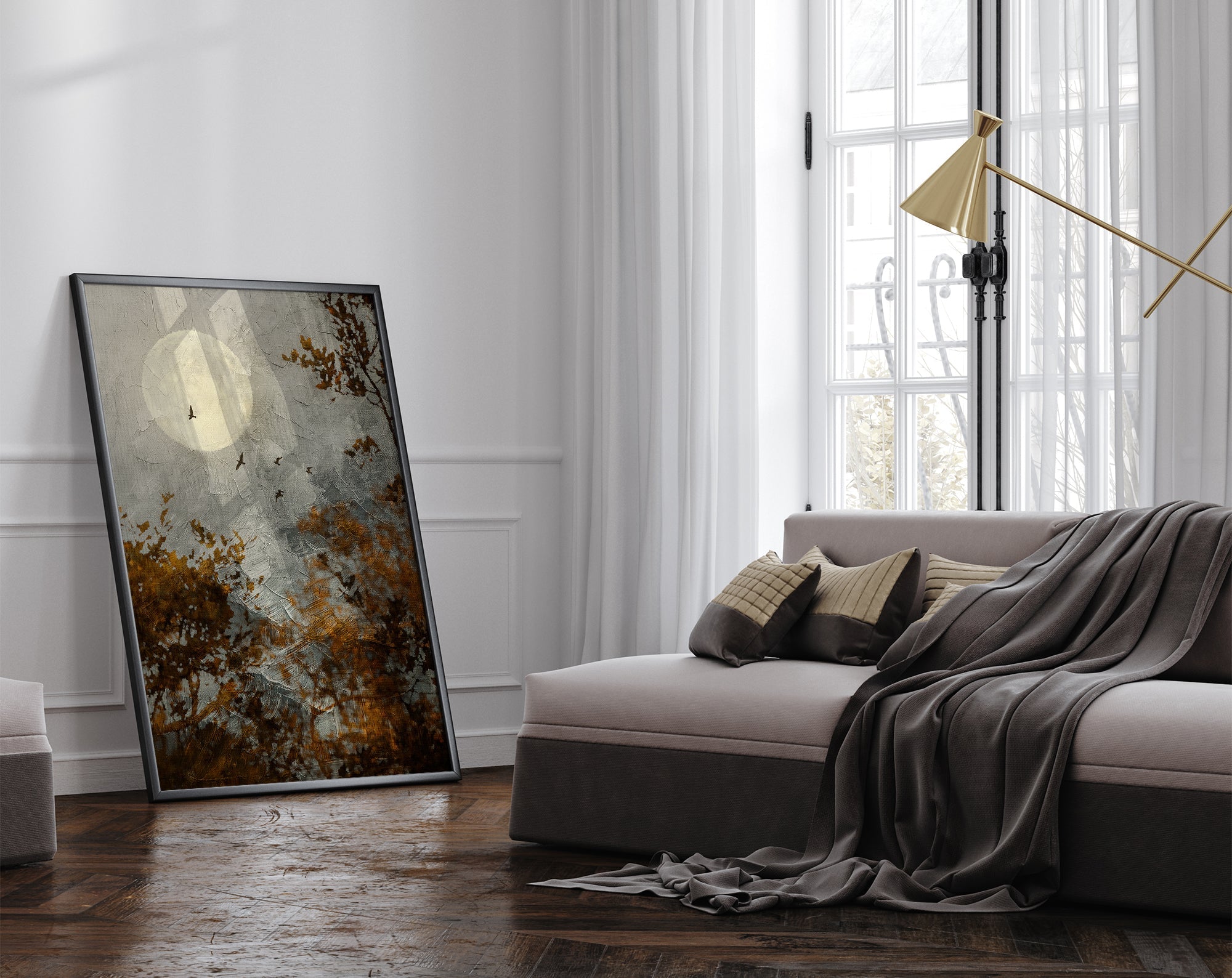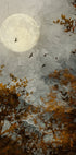 En glødende høstmåne løfter natten, mens en heks strejfer over himlen, flagermus kredser og et skævt herresæde vogter over en forblæst majsmark. Skeletagtige træer kradser mod stjernerne, græskar lyser i mørket, og tågen snor sig ad stien – en filmisk Halloween-scene fuld af spænding og sug i maven.