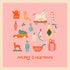 Eine rosa, nostalgische Weihnachtsillustration gefüllt mit kleinen, bezaubernden Weihnachtsmotiven wie Geschenk, Rentier, Weihnachtskugeln, Spielzeugroboter, Kuchen, Weihnachtsbaumauto und Stöcken. Der Stil ist Retro und die Farben sind sanft und warm, und unten steht der Text „Frohe Weihnachten“.