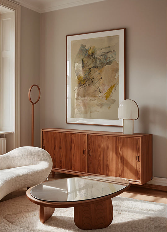 Hot July von Gemma Bardot – eine abstrakte Komposition mit warmen Gelbtönen, Beigetönen und freien Pinselstrichen. Organische Linien und verspielte Kritzeleien sorgen für Bewegung und sommerliche Energie, während neutrale Felder für Ruhe und Ausgeglichenheit sorgen. Ein modernes Statement-Poster, das den Raum mit sonniger Leichtigkeit erhellt. Perfekt für Wohnzimmer, Büro und kreative Ecken.