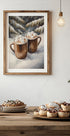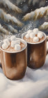 Eine dampfende Tasse heißer Kakao mit weichen Marshmallows steht auf einer einfachen Untertasse, umgeben von winterlichem Frost und einem Hauch von Schneeflocken in der Luft. Die gedämpften, gemütlichen Farbtöne fangen das Gefühl kalter Tage und warmer Hände ein. Ein stimmungsvolles Motiv von Andreas Magnusson, perfekt für die Weihnachts- und Winterzeit im Zuhause.