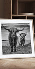 Ein eindrucksvolles, monochromes Porträt einer Highland-Kuh, bei dem lange Ponyfrisuren und markante Hörner eine raue, grafische Silhouette vor einem weichen, nebligen Hintergrund bilden. Die tiefen Kontraste gleichen Ruhe und Wildheit aus und verleihen dem Motiv zeitlose Kraft. Foto von Stéphane Pecqueux. Perfekt als Blickfang im Wohnzimmer, im Büro oder in der modernen, nordischen Einrichtung.
