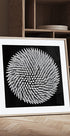 Hypnose von Giorgio Toniolo ist eine monochrome, grafische Komposition, in der konzentrische Kreise und Ringe ein symmetrisches, fast kugelförmiges Muster mit starkem Kontrast bilden. Fibonacci-inspirierte Proportionen und eine straffe Geometrie erzeugen eine hypnotische Tiefe und einen ruhigen, minimalistischen optischen Puls. Die grafische Sphäre balanciert zwischen Ordnung und Illusion.