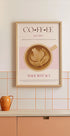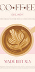 Vintage-Kaffeeposter mit einer Tasse Latte und aufwendiger Latte-Art, die frisch gebrühten Kaffee aus gerösteten Bohnen hervorhebt. Mit Schwerpunkt auf italienischer Handwerkskunst zeigt das Design die Kaffeekultur seit 1979. Perfekt für die Dekoration und das Branding von Coffeeshops.