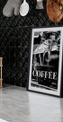 Ein auffälliges Schwarz-Weiß-Poster mit dem Wort „COFFEE“ kombiniert mit einer Nahaufnahme einer Espressomaschine, die frischen Kaffee in eine Tasse gießt. Dieses minimalistische typografische Design eignet sich perfekt für Küchenwände, Cafés oder Cafés und kombiniert Inspiration mit einer stilvollen monochromen Ästhetik.