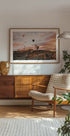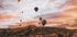 Eine atemberaubende Landschaft Kappadokiens in der Abenddämmerung mit Heißluftballons, die über den Himmel fliegen. Die warmen Wüstenfarben und dramatischen Wolken vermitteln ein Gefühl von Freiheit und Abenteuer, perfekt für von Reisen inspirierte Wandkunst.