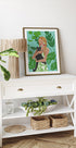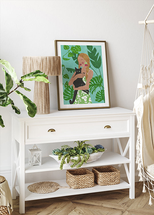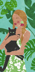 Eine lebhafte Illustration einer Frau, die eine schwarze Katze hält, umgeben von üppigen Monstera-Blättern. Die kräftigen Farben und die tropische Ästhetik sorgen für einen warmen, modernen Ausdruck, ideal für Katzenliebhaber und botanische Innenräume.