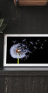 A beautiful close-up of a dandelion releasing its seeds into the air against a dark background. The floating fluff symbolizes freedom, fragility and fleeting beauty, making this artwork a poetic choice for any decor.