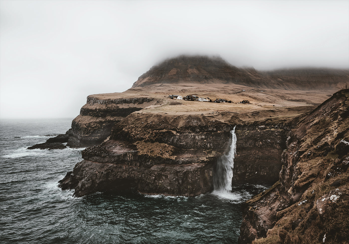 Der berühmte Wasserfall Múlafossur ergießt sich anmutig in den Atlantik, umgeben von dramatischen Klippen und einem bezaubernden Dorf auf einem windgepeitschten Plateau der Färöer-Inseln. Tief hängende Wolken bedecken die Berge und verleihen diesem abgelegenen Ort noch mehr Schönheit.