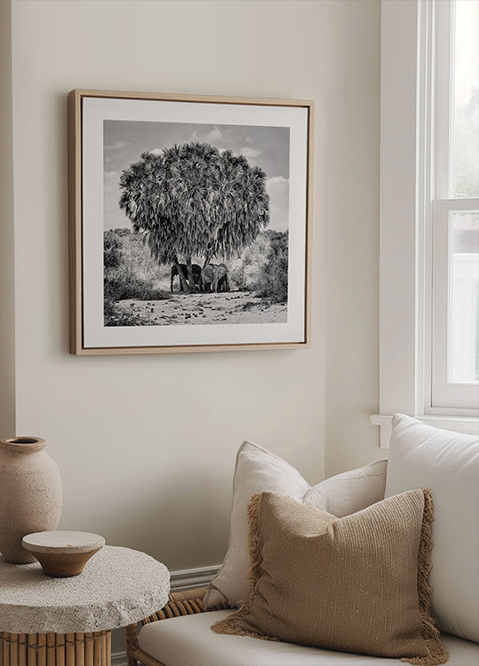 Mittagstreffen vom Fotografen Marcel Rebro fängt eine Elefantenherde ein, die sich im Schatten eines einsamen Baumes in der ostafrikanischen Savanne versammelt. In dramatischem Schwarzweiß zeichnen die scharfen Schatten der Mittagssonne die Konturen nach und schaffen eine ruhige, zeitlose Szene aus Tsavos wilder Landschaft. Perfekt für Liebhaber von Natur, Safari und klassischer Fotografie.