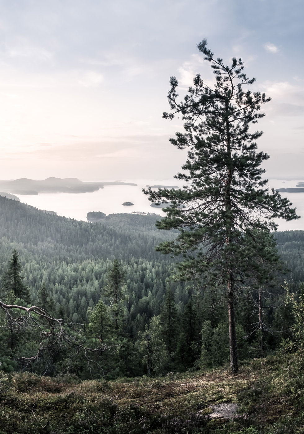 Eine friedliche Landschaft, die die Schönheit eines nordischen Waldes mit Blick auf einen großen See einfängt. Im Vordergrund steht eine einsame Kiefer, während endlose Reihen von Nadelbäumen im nebligen Horizont verschwinden. Der Himmel in sanften Pastelltönen verstärkt die ruhige und verträumte Atmosphäre und macht dieses Kunstwerk zu einer perfekten Ergänzung eines von der Natur inspirierten Dekors.