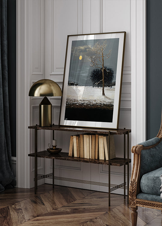 On the Outskirts of a Snowy Evening Forest Painting – Moonlit Winter Landscape Art for Home, Office or Gift Interior Plakat