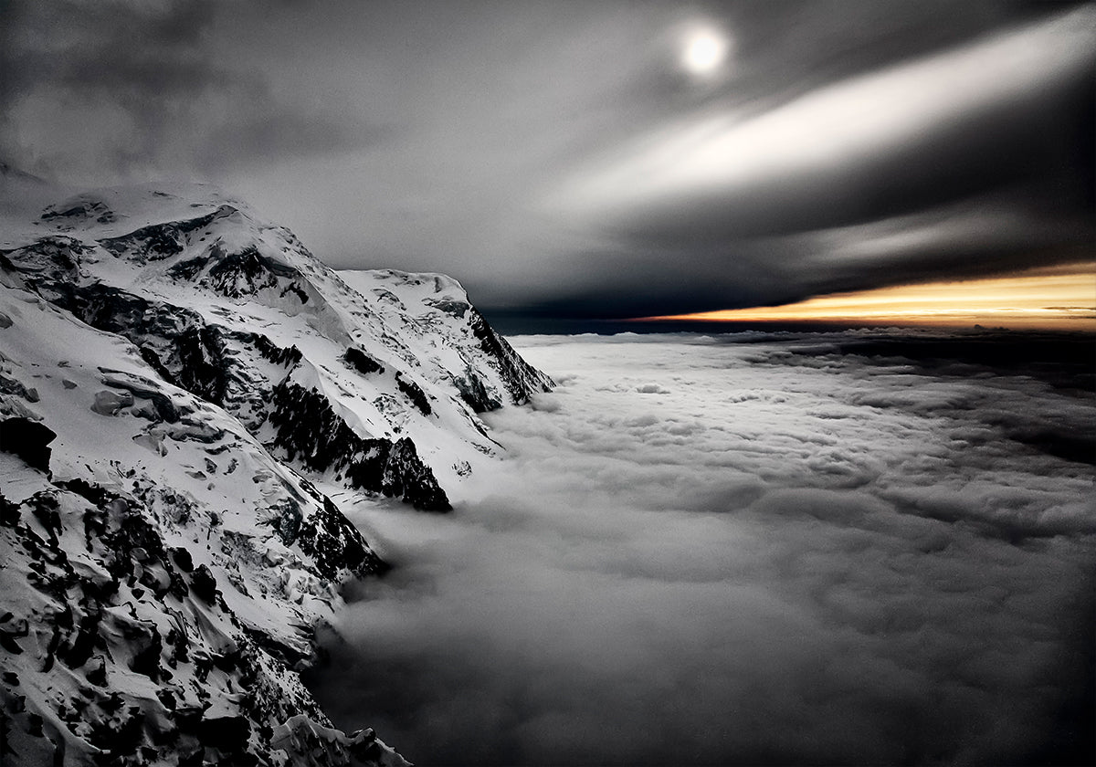 Overcast af fotografen Tristan Shu fanger en vinterkold morgen over Alperne ved Mont Blanc, hvor takkede bjergkamme rejser sig over et hav af skyer. Dis og rimfrost blødgør konturerne, mens solens svage lys bryder igennem og skaber en rolig, dramatisk stemning af højder, kulde og stille storhed. Perfekt til elskere af vilde bjerge.