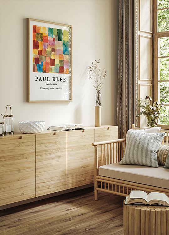 Ein lebendiges und dynamisches Kunstwerk von Paul Klee aus dem Jahr 1914, das ein abstraktes Mosaik aus leuchtenden Farben zeigt. Dieses Aquarell zeigt Klees außergewöhnliche Fähigkeiten in der Farbtheorie und seinen charakteristischen Stil der geometrischen Abstraktion. Das Zusammenspiel zwischen warmen und kühlen Farbtönen verleiht dem Werk eine rhythmische und harmonische Anmutung, ideal für moderne Kunstsammlungen.
