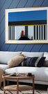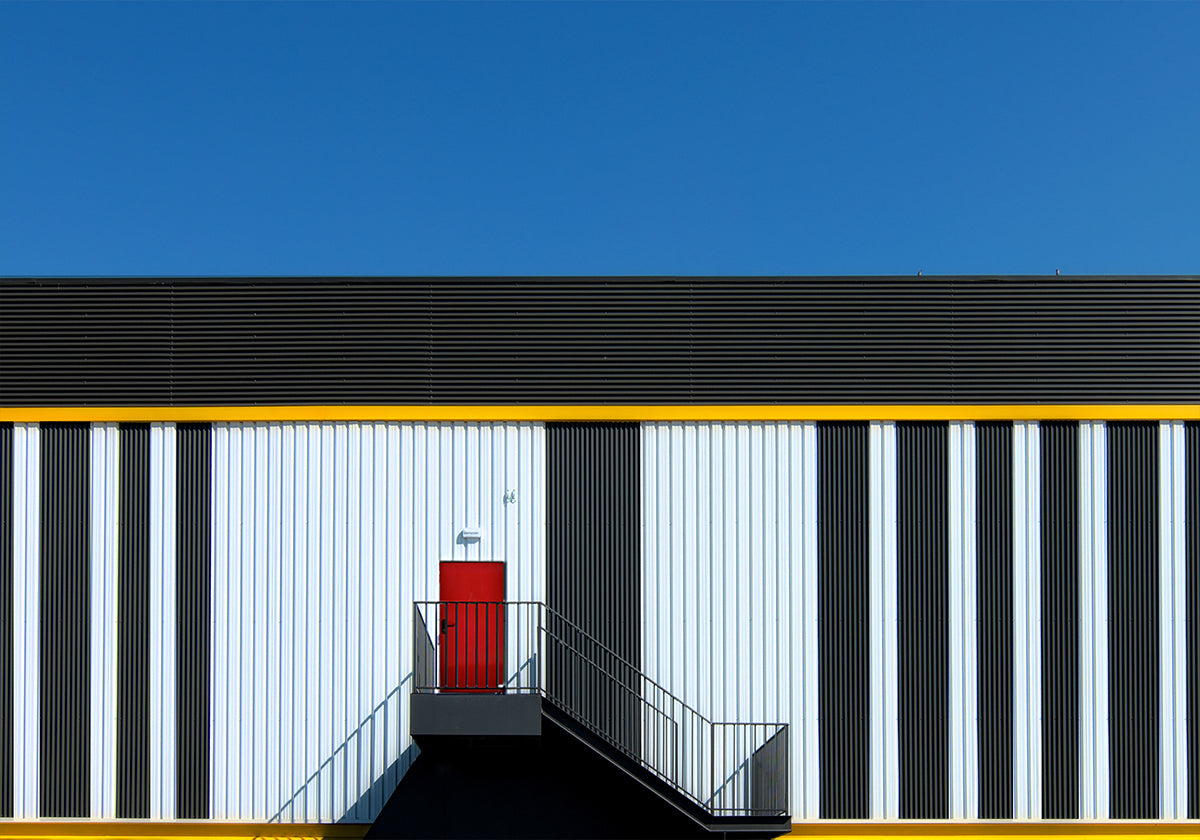 Piano af Alfonso Novillo fanger byens rytme i en grafisk komposition af røde og gule porte, bølgeblik og skarpe linjer mod en klar blå himmel. En industriel facade med trapper og stramme striber skaber stærke kontraster og arkitektonisk ro—perfekt til moderne, urban indretning. Inspireret af byen Madrid forener motivet containerlook og grafisk ro.