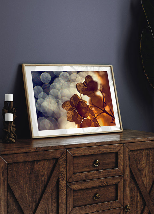 Dieses bezaubernde Makrofoto fängt getrocknete Hortensienblätter ein, die in warmem goldenem Licht vor einem verträumten Hintergrund aus kreisförmigem Bokeh leuchten. Die feinen Adern in den Blättern sorgen für aufwendige Details, während die leuchtende Atmosphäre Eleganz, Nostalgie und zeitlose botanische Schönheit ausstrahlt.