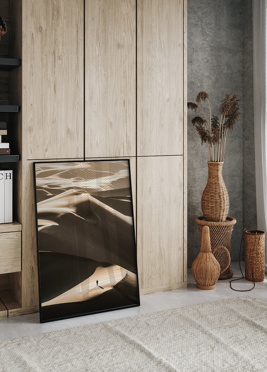 „Walking In Desert“ ist ein eindrucksvolles Poster, das den Moment einer einsamen Gestalt einfängt, die durch eine weite Wüste geht. Die offene Landschaft mit sanften Dünen vermittelt ein Gefühl von Unendlichkeit und Freiheit, während das sanfte Licht die Textur des Sandes hervorhebt und dem Bild eine warme und ruhige Atmosphäre verleiht. Dieses Poster spricht alle an, die Reisen, Abenteuer und die raue Schönheit der Natur lieben. Es passt perfekt in Innenräume, die eine minimalistische und stilvolle Ästhetik betonen möchten, und kann Gedanken an Entdeckungen und innere Reisen inspirieren.