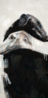 Ein ausdrucksstarkes digitales Gemälde von zwei Windhunden in liebevoller Umarmung, deren Körper sich in einer zärtlichen Pose überlappen. Das Kunstwerk kombiniert realistische Hundeporträts mit abstrakten Pinselstrichen und floralen Details und schafft so eine harmonische Balance zwischen Emotion und Kunst. Ein berührendes Stück, das Liebe, Verbundenheit und Freundschaft symbolisiert.