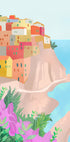 Eine bezaubernde, von Aquarellen inspirierte Illustration von Cinque Terre, Italien. Pastellfarbene Häuser auf den Felsen mit Blick auf das blaue Meer, umgeben von üppigen Pflanzen und Blumen. Ein perfektes Motiv für Reisende und Küstendekoration.