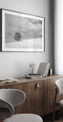 Ein klares, monochromes Wintermotiv von Hans Peter Rank: Eine einsame Baumsilhouette steht auf einem schneebedeckten Hang, während entfernte Berggipfel im Nebel der Wolken verschwinden. Die sanften Grautöne und der offene Negativraum erzeugen Ruhe, Melancholie und Zeitlosigkeit – einen poetischen Bruch in der Landschaft. Der Kontrast zwischen dem weißen Schnee und dem schweren Himmel unterstreicht die Stärke des Baumes.