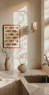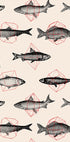 Ein modernes Kunstposter mit detaillierten Fischillustrationen kombiniert mit geometrischen roten Formen. Durch Wiederholung und Symmetrie entsteht ein einzigartiges Muster, das Natur mit abstrakter Geometrie vereint und es zu einem auffälligen Stück moderner Wandkunst macht.