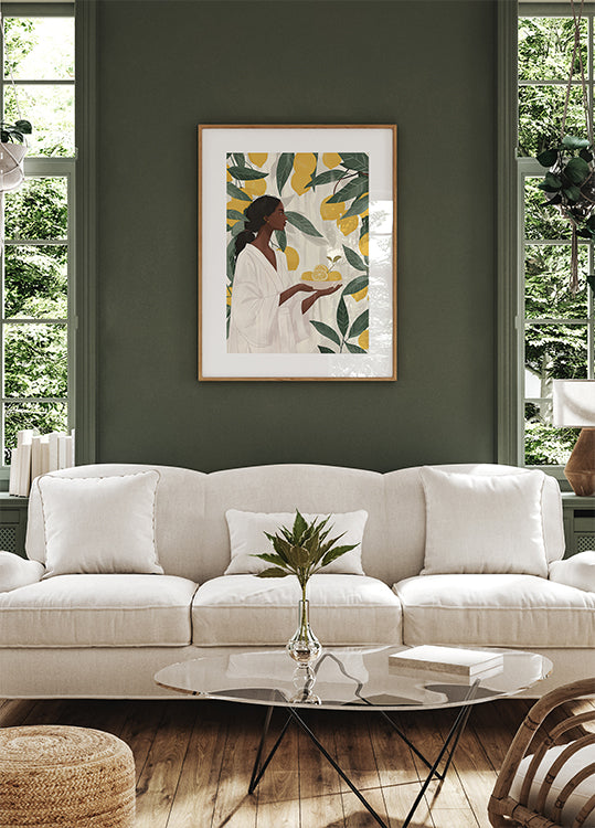 Ein stilvolles und modernes Kunstwerk, das eine anmutige Frau in einem Zitronenhain zeigt, die eine Schale mit frischen Zitronen hält. Die leuchtend gelben Früchte bilden einen schönen Kontrast zu den üppigen grünen Blättern und schaffen eine ruhige und elegante Komposition für zu Hause oder das Büro.