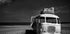 Ein eindrucksvolles Schwarz-Weiß-Foto eines verlassenen Oldtimerbusses, der an einem Sandstrand gestrandet ist. Mit auf dem Dach gestapelten abgenutzten Koffern und dem Meer im Hintergrund drückt das Bild verlassene Reisen, Verfall und den Lauf der Zeit aus.