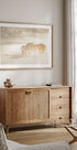 Eine poetische, in Nebel gehüllte Herbstlandschaft, in der goldene und orangefarbene Bäume sanft im dunstigen Morgenlicht leuchten. Die verträumte Atmosphäre fängt die stille Schönheit der Natur im Übergang zum Herbst ein und macht dies zu einem beruhigenden und eindrucksvollen Kunstwerk für jedes Interieur.