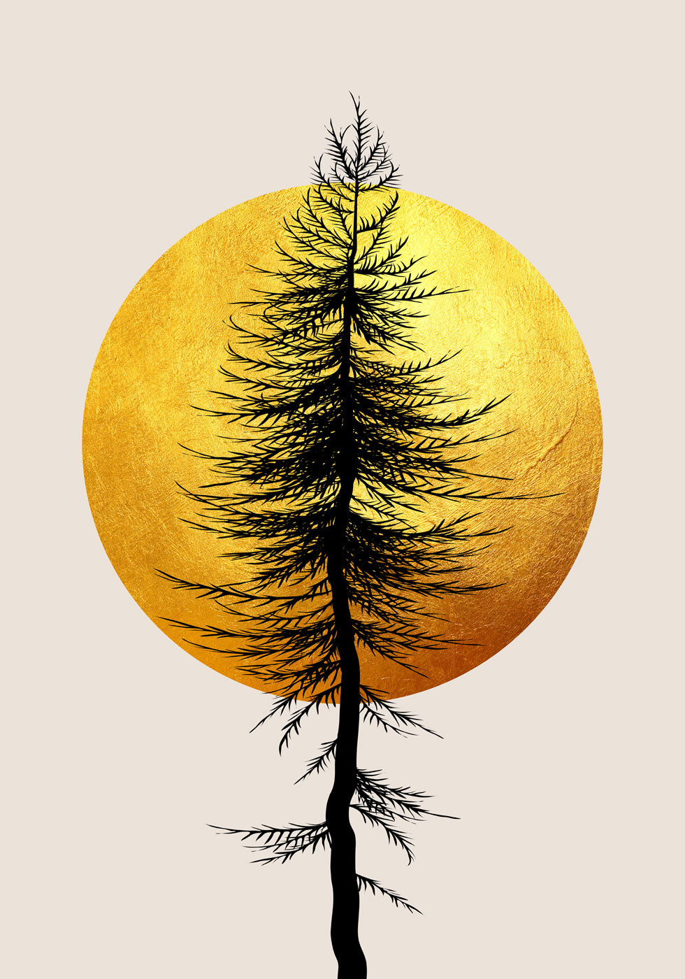 Eine auffällige minimalistische Komposition mit einem schwarzen Baum, der sich vor einer strahlend goldenen Sonne abhebt. Der strukturierte Goldhintergrund bildet einen schönen Kontrast zu den zarten Zweigen und sorgt für eine moderne und von der Natur inspirierte Ästhetik. Perfekt für Liebhaber eleganter Schlichtheit, skandinavischem Dekor und modernem Design.