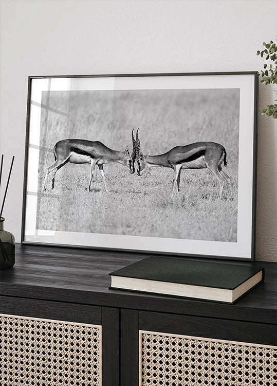 Ein kraftvolles Schwarz-Weiß-Tierfoto von zwei Gazellen, die sich in einem Duell gegenüberstehen, wobei ihre Hörner vor Kraft und Herausforderung aufeinanderprallen. Dieses in der riesigen Savanne der Serengeti aufgenommene Bild vermittelt rohe Energie, Überleben und den zeitlosen Geist der Wildnis.
