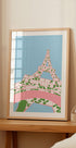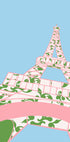 Eine moderne und lebendige Illustration des Eiffelturms in Paris, verziert mit verspielten grünen Blumenmustern auf zartrosa Linien vor einem klaren blauen Himmel. Dieses Kunstwerk verleiht einem der berühmtesten Wahrzeichen der Welt eine frische, feminine und stilvolle Note und eignet sich perfekt für feminine Innenräume, von Reisen inspirierte Räume oder als Statement-Stück an der Wand.