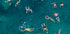Eine farbenfrohe Luftaufnahme von Menschen, die im kristallklaren türkisfarbenen Wasser schwimmen und schweben. Diese lebhafte Sommerszene fängt die Freude an Freizeit, Freiheit und Erfrischung unter der Sonne ein. Perfekt, um Urlaubsstimmung und Entspannung am Meer hervorzurufen.