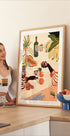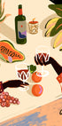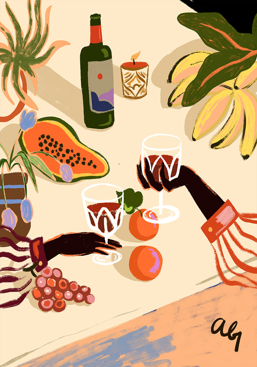 Eine farbenfrohe Illustration eines tropisch inspirierten Stilllebens mit Händen, die Weingläser zwischen frischem Obst, Blumen und Pflanzen anstoßen. Mit kräftigen Farben und verspielten Details fängt das Werk die Wärme des geselligen Beisammenseins und des Bierlebens ein und wird zu einem lebendigen und stilvollen Statement.