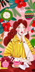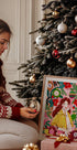 Eine warme Retro-Weihnachtsszene: Eine lächelnde rothaarige Frau in einer gestreiften Bluse genießt dampfenden Tee neben einem glitzernden Weihnachtsbaum voller Kugeln und Girlanden. Schnee glitzert im Fenster, Farben in Rosa und Tannengrün sorgen für Nostalgie. Eine gemütliche, von der Mitte des Jahrhunderts inspirierte Illustration von Caroline Bonne Müller. Perfekt für Winterspaß.