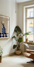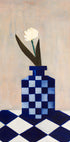 Ein modernes Stillleben mit einer markanten blau karierten Vase und einer einzelnen, zarten Blume. Mit der Kombination aus geometrischen Mustern und Minimalismus verleiht dieses Stück Eleganz und künstlerischen Charme in moderne Innenräume.