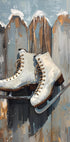 Eine poetische Winterszene: Ein Paar klassischer Schlittschuhe hängt lässig über einem alten Zaun, Spuren von Schnee und Kälte liegen in der Luft. Gedämpfte, nordische Farbtöne und sanftes Licht sorgen für Ruhe, Nostalgie und Winterfreude. Perfekt, um Erinnerungen an Eisbahnen, ruhige Tage und kleine Abenteuer einzurahmen. Das Motiv wurde von Ohkimiko erstellt. In einem einfachen, zeitlosen Ausdruck.