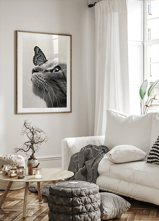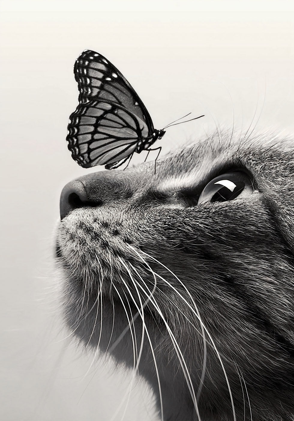 Ein herzerwärmendes Schwarz-Weiß-Bild, das einen Moment der Neugier zwischen einer Katze und einem Schmetterling einfängt. Die großen Augen der Katze und die zarten Flügel des Schmetterlings ergeben eine künstlerische und beruhigende Komposition. Perfekt für Tierliebhaber und minimalistisches Dekor.