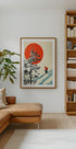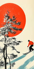 Ein elegantes Retro-Poster von Andreas Magnusson: Ein Skifahrer schneidet eine Spur einen verschneiten Berghang hinunter, flankiert von dunklen Bäumen, während eine große rote Sonne am Himmel aufgeht. Die klare Komposition und die Vintage-Farben verbinden japanischen Minimalismus mit klassischem Ski-Spirit – perfekt für nordische Ruhe und Abenteuerlust. Jetzt.