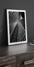 Eine monochrome Stadtszene aus Amsterdam mit dramatischen Perspektiven, in der schlanke Türme und Masten in den Himmel schießen. Die grafischen Linien und scharfen Kontraste sorgen für Rhythmus und Ruhe, während das Sommerlicht gleichzeitig die Fassaden zeichnet. Eine moderne, urbane Atmosphäre, dargestellt vom Künstler Willem. Perfekt für Liebhaber von Architektur und Stadtleben.