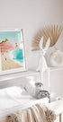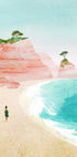 Eine friedliche Küstenillustration mit einer einsamen Figur, die an einem Sandstrand mit türkisfarbenen Wellen und roten Felsen im Hintergrund spaziert. Inspiriert von der Küste der Algarve in Portugal fängt dieses Kunstwerk die Ruhe und Harmonie des Sommers am Meer ein.