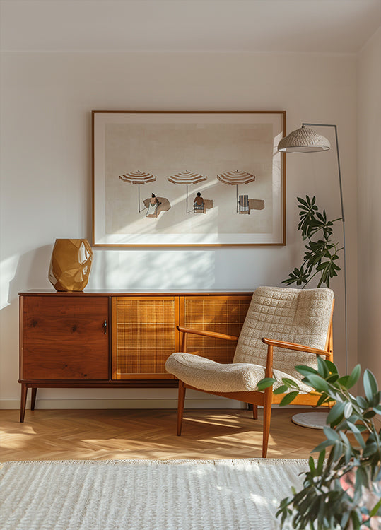 Eine ruhige und schlichte Illustration mit drei gestreiften Sonnenschirmen und zwei Personen in Liegestühlen an einem hellen Strand. Die gedämpften Farben und die entspannte Komposition vermitteln ein Gefühl sommerlicher Ruhe und mediterraner Atmosphäre. Perfekt für Sommerhäuser, moderne Häuser oder Galeriewände.
