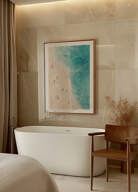 Eine ruhige und stilvolle Luftaufnahme von Menschen, die am Ufer entlang spazieren, wo das türkisfarbene Meer auf den hellen Sand trifft. Ideal für Sommerhäuser, küstennahe Räume und moderne Wandkunst.